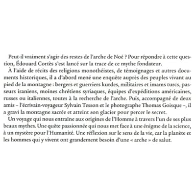 À 4 200 mètres d'altitude, dans les glaces du mont Ararat, un objet mystérieux fait de main d'homme a été photographié à partir de satellites et mesuré par des radars. Des échantillons de ce morceau de bois découvert en 1955 remonteraient à une époque contemporaine du déluge.Peut-il vraiment s'agir des restes de l'arche de Noé ? Pour répondre à cette question, Édouard Cortès s'est lancé sur la trace de ce mythe fondateur. À l'aide de récits des religions monothéistes, de témoignages et autres documents historiques, il a d'abord mené une enquête auprès des peuples vivant au pied de la montagne : bergers et guerriers kurdes, militaires et imams turcs, passeurs iraniens, moines chrétiens syriaques, équipes d'expéditions américaines, russes ou italiennes, toutes à la recherche de l'arche. Puis, accompagné de deux amis - l'écrivain-voyageur Sylvain Tesson et le photographe Thomas Goisque -, il a gravi la montagne sacrée et atteint son glacier pour percer le secret.Un voyage qui nous entraîne aux origines de l'Homme à travers l'un de ses plus beaux mythes. Une quête passionnée qui nous met face à une énigme de la science, à un mystère pour l'Humanité. Une réflexion sur le sens de la vie, car la planète et les hommes qui y vivent ont grandement besoin d'une " arche " de salut.